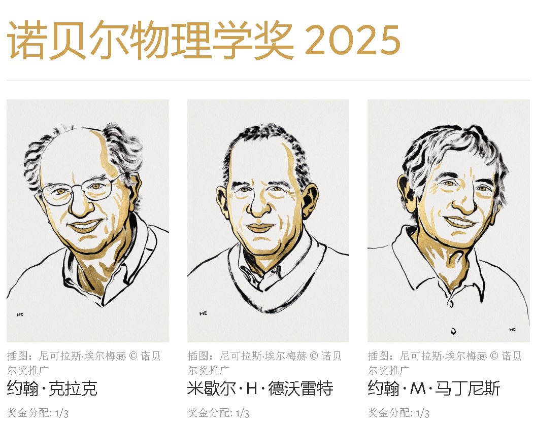 據(jù)諾獎官網(wǎng)介紹,約翰·克拉克于1942年出生于英國,為美國加利福尼亞大學伯克利分校教授;米歇爾·H·德沃雷1953年出生于法國,為美國耶魯大學和加利福尼亞大學圣巴巴拉分校教授;約翰·M·馬蒂尼斯出生于1958年,為美國加利福尼亞大學圣巴巴拉分校教授。