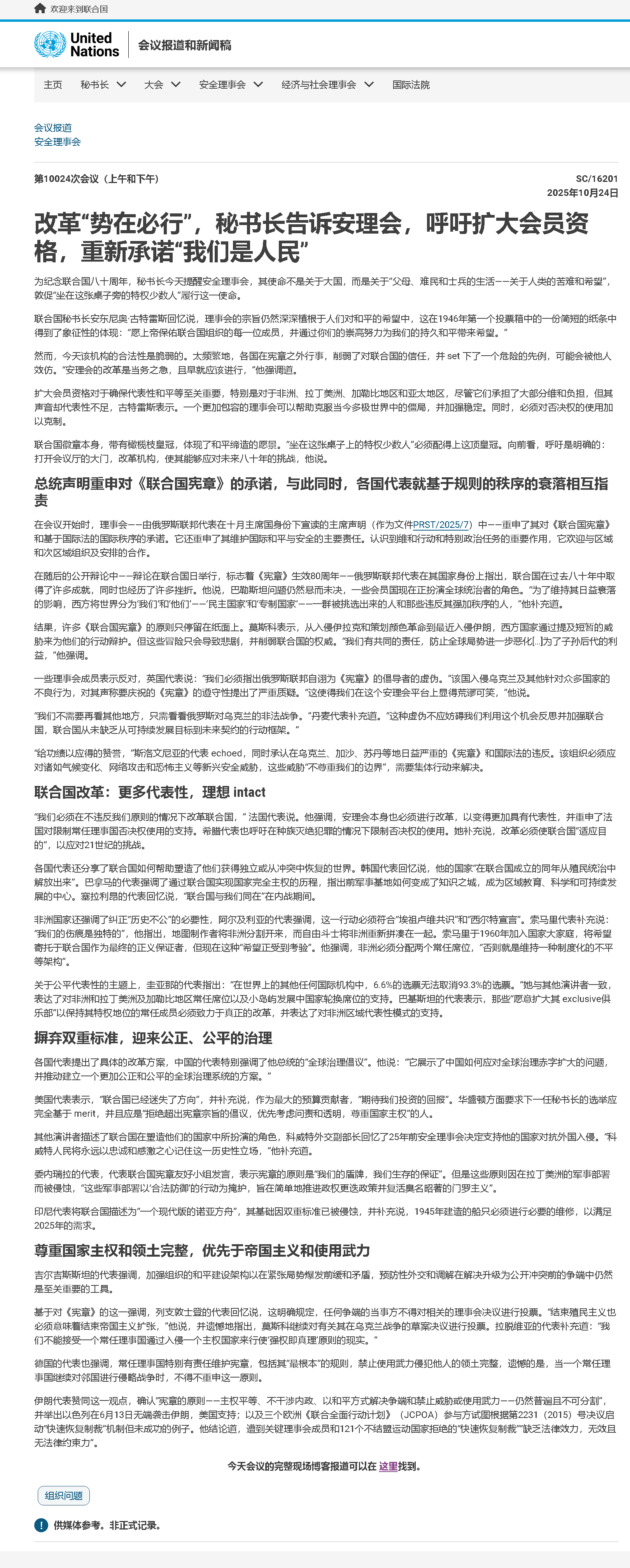 新華社聯(lián)合國10月24日電 今年10月24日是《聯(lián)合國憲章》生效80周年紀(jì)念日。聯(lián)合國安理會當(dāng)天舉行“展望聯(lián)合國未來”公開辯論會。中國常駐聯(lián)合國代表傅聰在會上發(fā)言,他指出中國領(lǐng)導(dǎo)人提出的全球治理倡議對聯(lián)合國未來發(fā)展具有很強(qiáng)的指導(dǎo)意義。