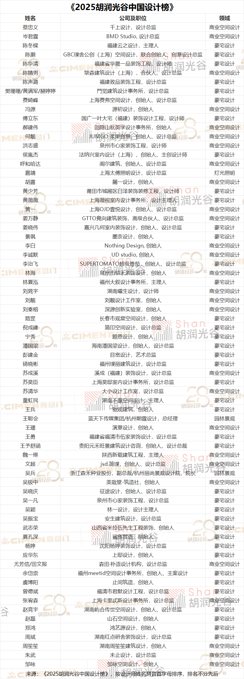《2025胡潤光谷中國設(shè)計榜》通過設(shè)計作品的創(chuàng)新性、美學(xué)價值、可持續(xù)性和商業(yè)價值進行綜合評選。共征集到逾百位設(shè)計師的申報材料,由知名設(shè)計師、跨界嘉賓、商業(yè)精英、KOL、企業(yè)家、藝術(shù)家組成的顧問評委團進行全面評審,最終71位設(shè)計師上榜,其中男性占84%,女性占16%。設(shè)計類別分布上,豪宅設(shè)計占6成,商業(yè)空間設(shè)計占4成。
