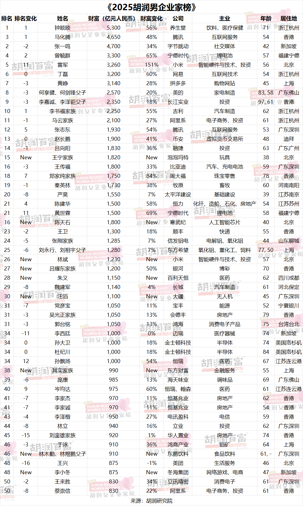上榜企業(yè)家上市公司財富計算的截止日期為2025年9月1日,美元與人民幣的兌換比例按照1:7.13計算,港幣與人民幣的兌換比例按照1:0.92計算,新臺幣與人民幣的兌換比例按照1:0.23計算。