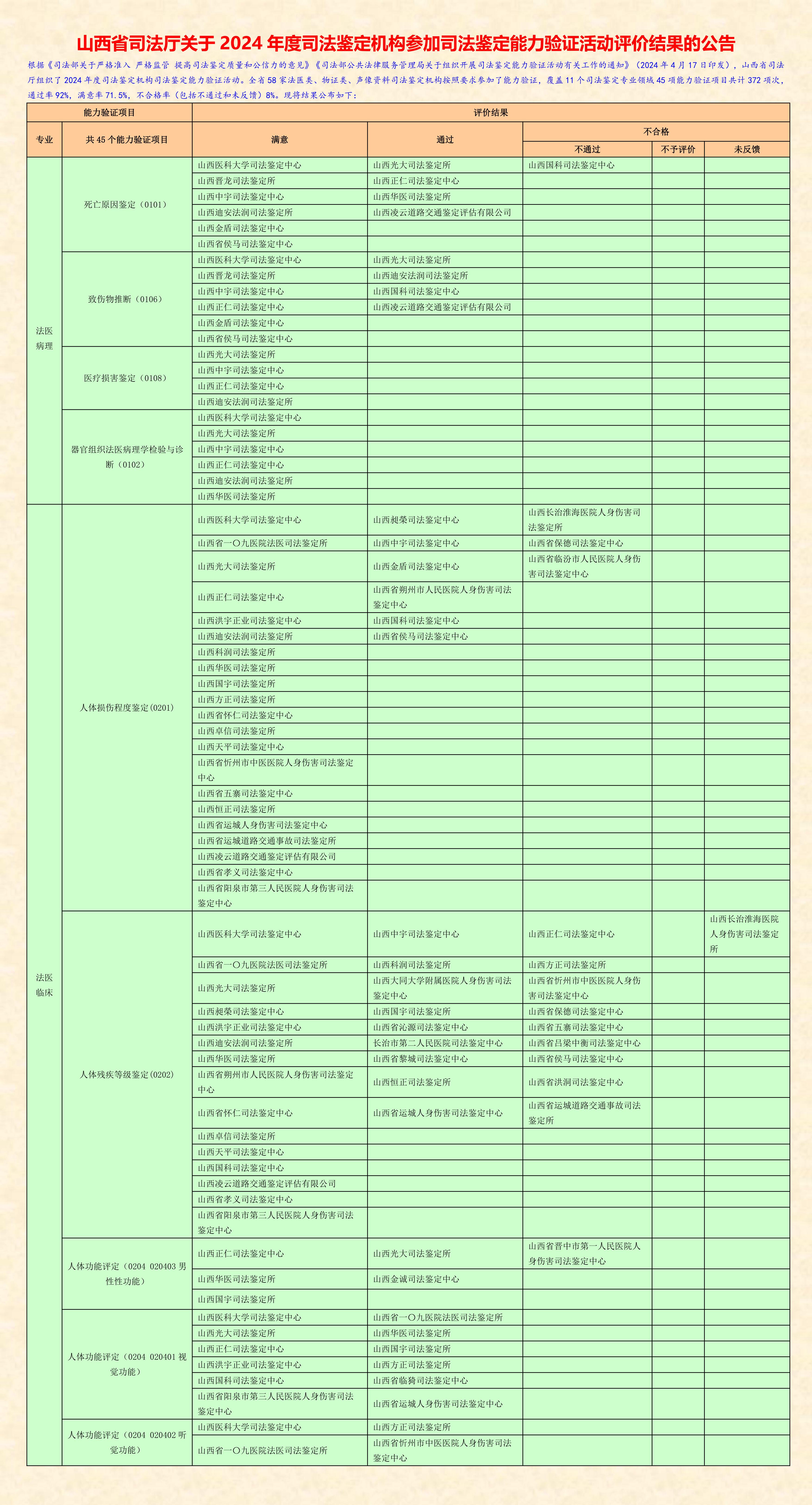 能力驗(yàn)證是對司法鑒定機(jī)構(gòu)和司法鑒定人能力評估的有效措施。根據(jù)《司法部公共法律服務(wù)管理局關(guān)于組織開展司法鑒定能力驗(yàn)證活動有關(guān)工作的通知》,省司法廳組織了2024年度司法鑒定機(jī)構(gòu)司法鑒定能力驗(yàn)證活動,全省58家法醫(yī)類、物證類、聲像資料司法鑒定機(jī)構(gòu)按照要求參加,覆蓋11個司法鑒定專業(yè)領(lǐng)域45項(xiàng)能力驗(yàn)證項(xiàng)目,共計372項(xiàng)次。