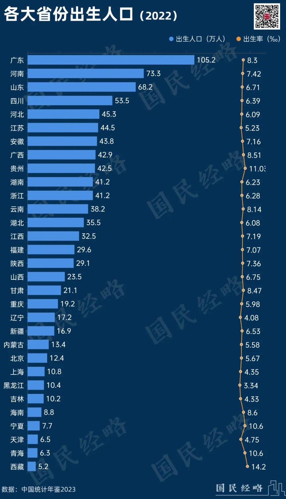 與之對(duì)比,同為全國TOP5人口大省的山東、河南、江蘇、四川,2022年出生人口分別為68.2萬、73.3萬、44.5萬、53.5萬。