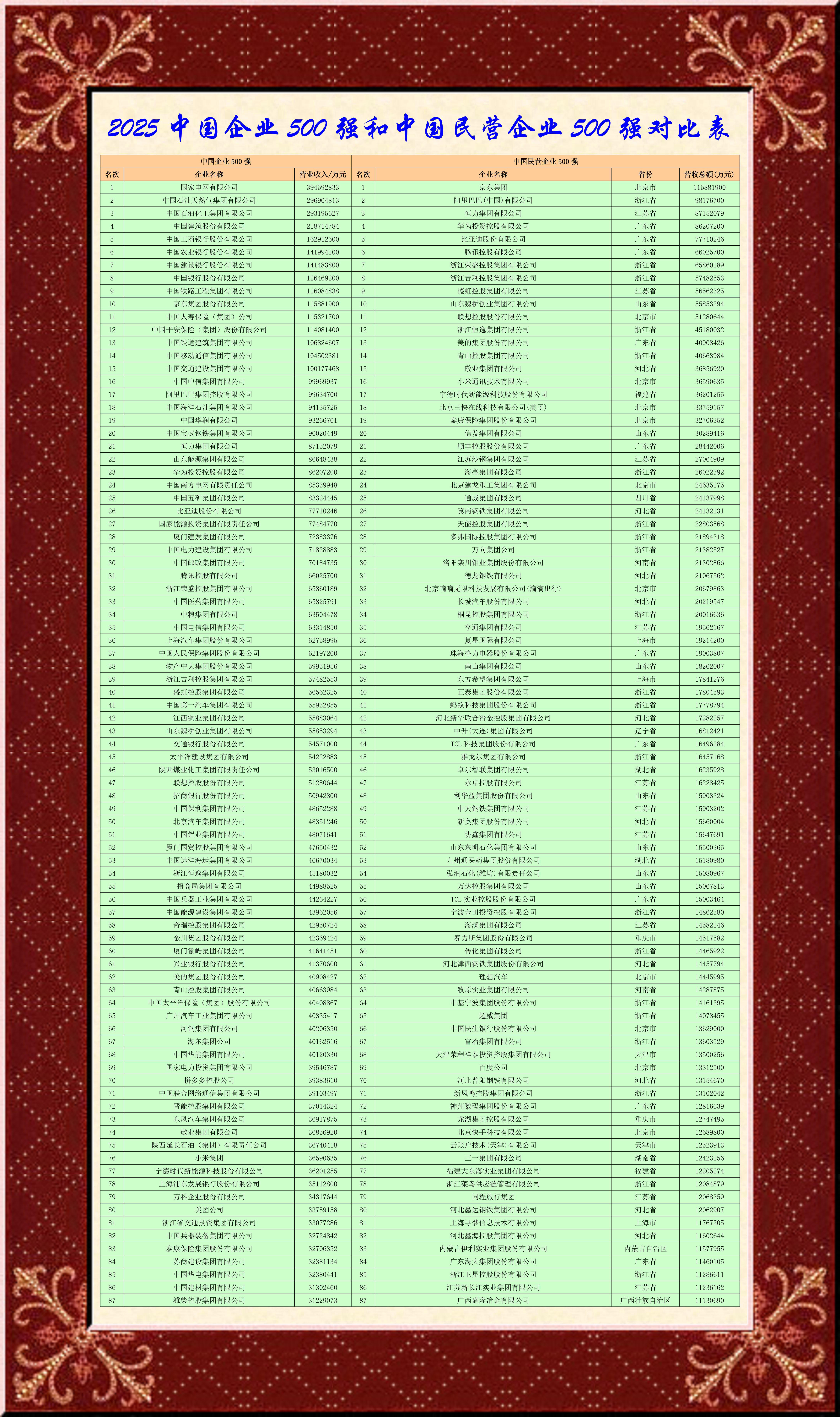2025中國(guó)企業(yè)500強(qiáng)和中國(guó)民營(yíng)企業(yè)500強(qiáng)對(duì)比表