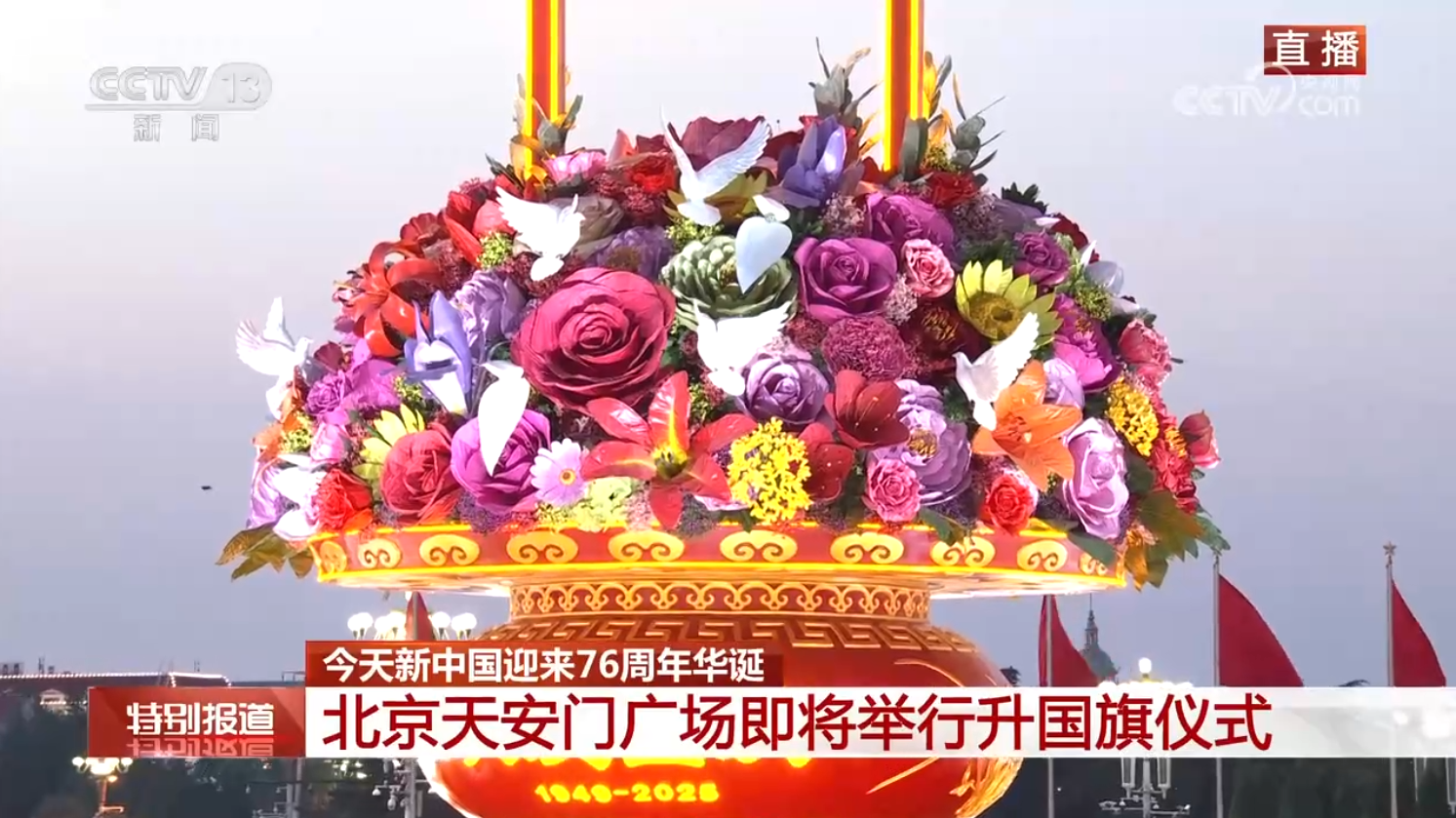五一廣場上巨型花籃璀璨奪目,慶祝中華人民共和國成立76周年。江建橋 攝